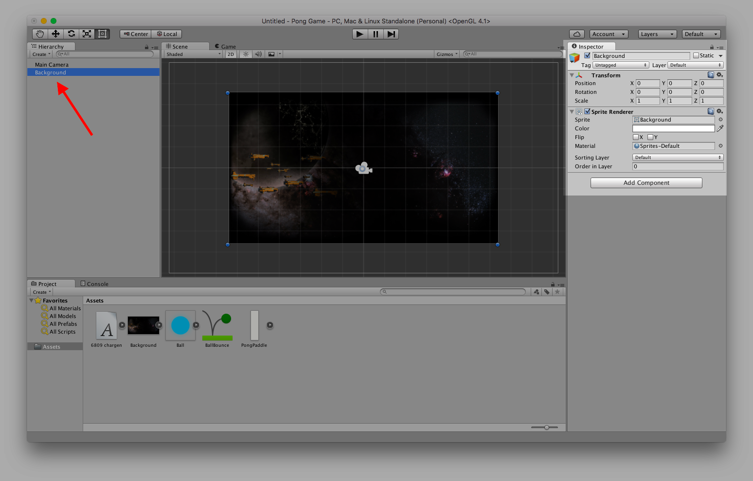 Click and drag the Background image from the Project pane into the Hierarchy pane, just below Main Camera. It should appear in your Scene view, and be centered by default. If it’s not centered, use the Inspector pane to set its Transform Position to (0, 0, 0).
