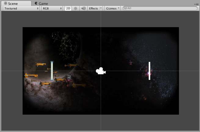 For the RightWall, set its Position to (5.8, 0, 0) and its Scale to (1, 6, 1). This will make it nice and tall. The LeftWall is the same, except its X Position is -5.8. (The numbers might be different on your computer – basically, just make sure your screen looks like the screenshot below, with the walls on the outside edges of each side of the camera view.)